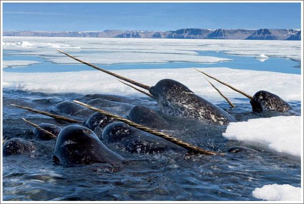 独角鲸,又名一角鲸,身长约4到5米,雄性略长于雌性。成年鲸平均体重800~1600公斤。与海豚和鲸鱼不同,独角鲸腹部呈白色,背部有许多深褐色或黑色的斑点。独角鲸最引人注目的特征是它们脑袋上伸出的长牙,那是从左上颚突出唇外的犬齿,长度可达2.8米,呈螺旋状,因为数量稀少,长期以来人们一直以为那是它的角,故而得名独角鲸。它牙齿平时除了打斗之外,还是它在家族当中地位的一种象征,独角鲸的牙齿越长、越粗,代表它在鲸群中的地位越高。在西方神话中的独角兽的角,就是以独角鲸牙为雏形虚化出来的。独角鲸主要分布在大西洋北部和北冰洋海域,现存量大约3万头,数量远低于同样以牙齿引以为傲大型陆地生物—大象。独角鲸活动区域主要集中在加拿大北部和格陵兰岛西部的海湾和水湾。当地原著民爱斯基摩人与因紐依特人长期以来有捕杀独角鲸的习惯,因为当地人需要鱼肉与鱼油作为生活补给。但是由于法律保护,每年的捕鲸配额只有300-400头。